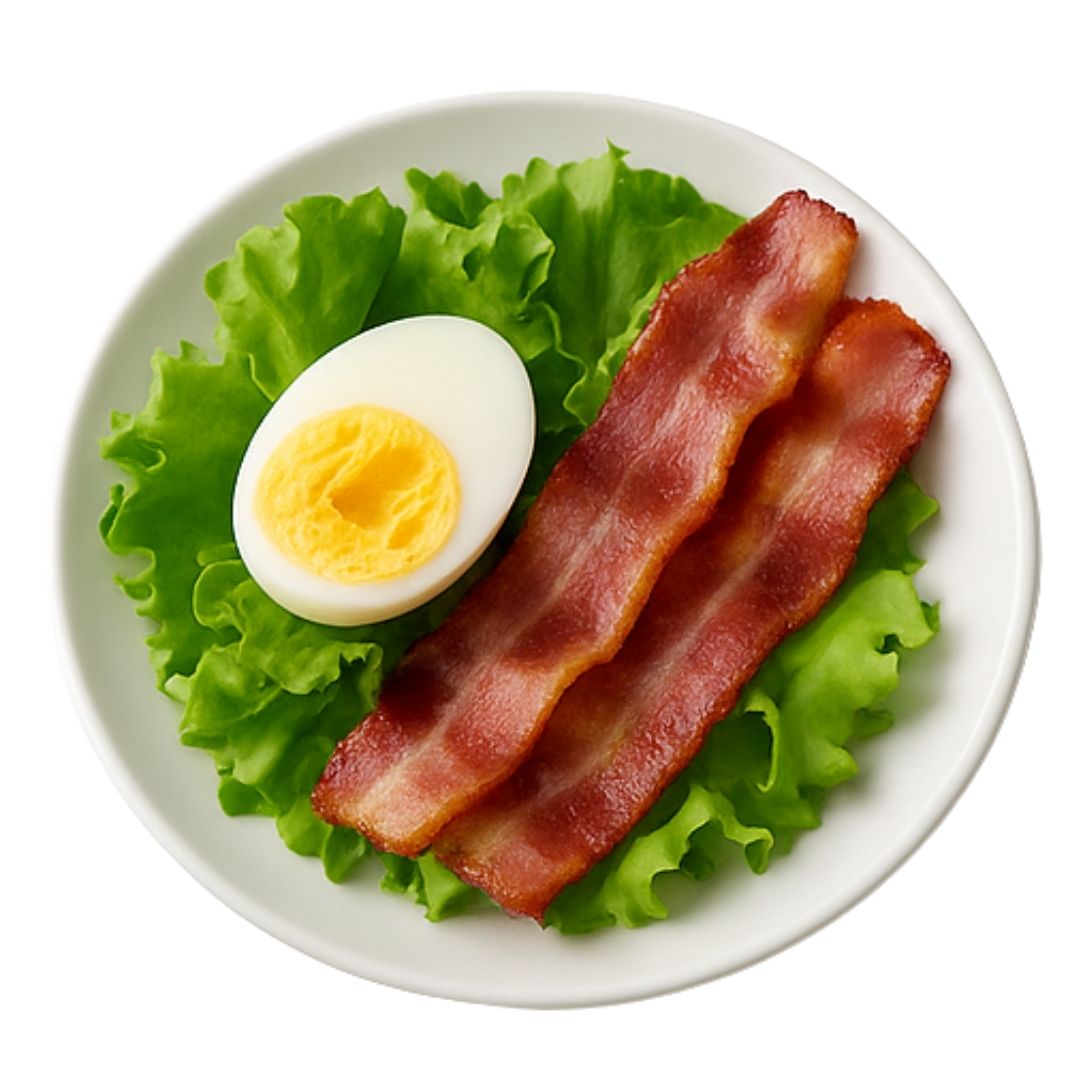 * Jajka – 2 szt. (120 g) * Boczek – 40 g * Sałata mieszana – 40 g * Ogórek – 80 g * Oliwa z oliwek – 10 g * Sól – 1 g * Pieprz – do smaku