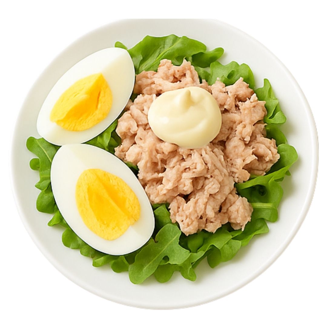 * Jajko – 1 szt. (60 g) * Tuńczyk z puszki – 1/2 puszki (60 g po odsączeniu) * Sałata – garść * Majonez – 1 łyżka (15 g) * Sól, pieprz – do smaku